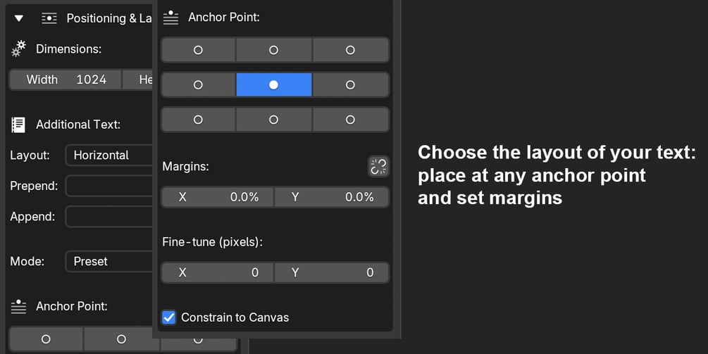 .ttf/.otffiles, adjust layout (horizontal or vertical), and manage spacing between text blocks. - Position designs using a 9-point anchor grid, manual percentage/pixel coordinates, offsets, and optional canvas constraints.