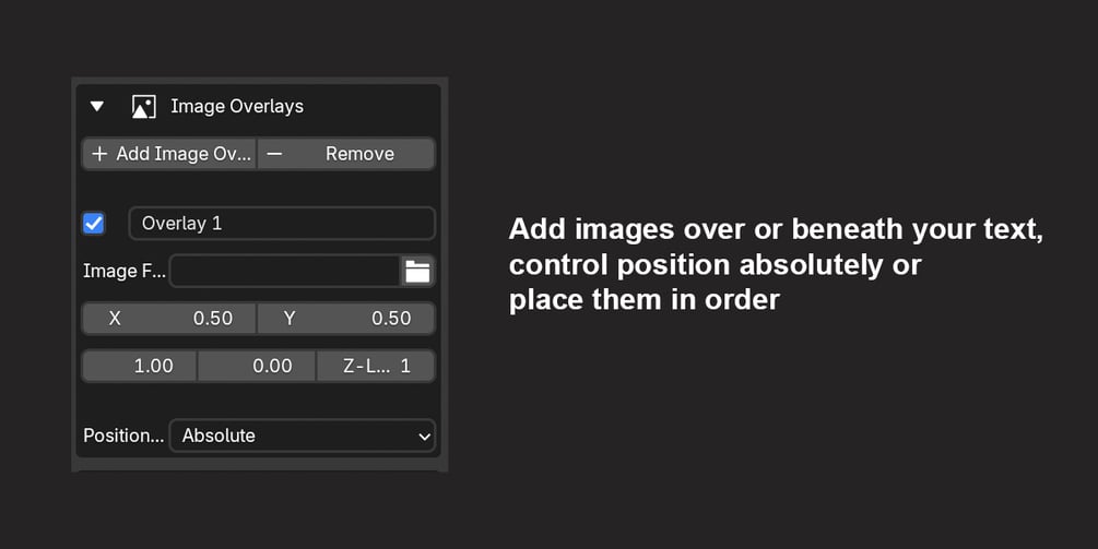 - Overlay system. Add any number of text or image overlays with independent scale, rotation, spacing, z-index, and absolute/prepend/append placement. SVG overlays are rasterized automatically with CairoSVG for crisp results.