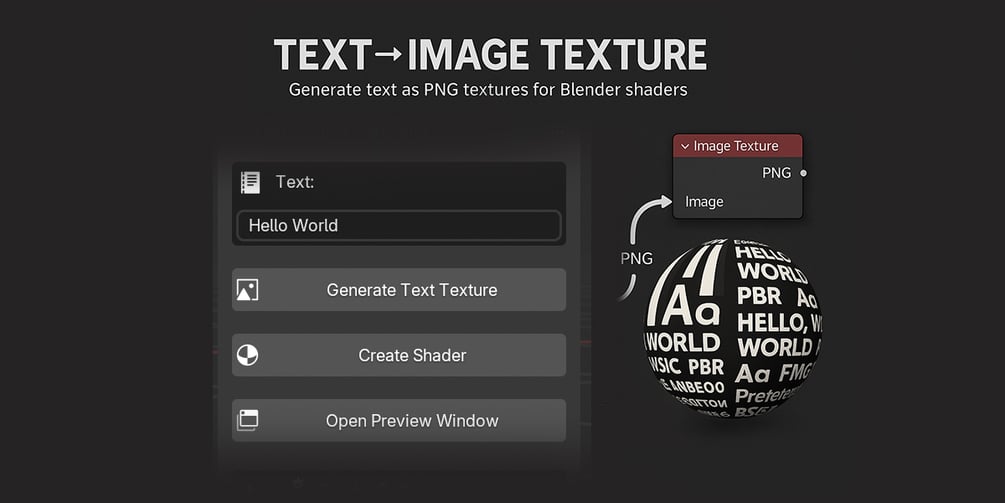 Create polished text textures without leaving Blender. This addon drops a dedicated panel into the Shader Editor, 3D Viewport, and Properties sidebar so you can type, preview, and generate textures in a couple of clicks.