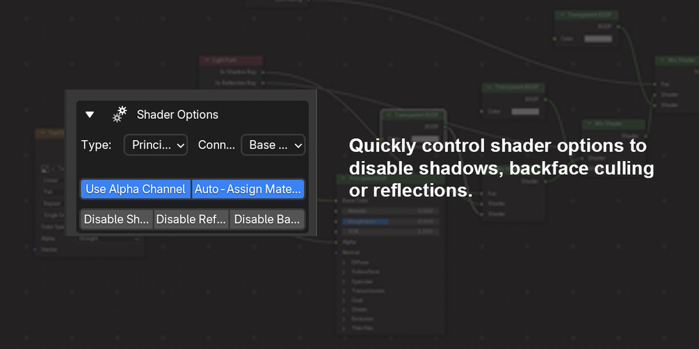 - One-click shaders. Build Principled, Emission, or Transparent materials complete with optional normal-map hookups, light-path controls (disable shadows/reflections/backfaces), and automatic assignment to the active object.